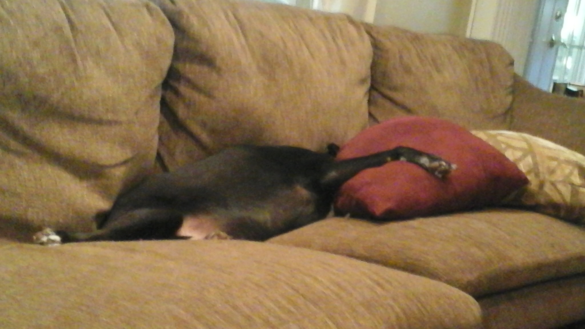 With Mike gone this week, Kathryn and I have been living like bachelorettes (slobs). We eat dinner watching bad TV – that’s if we eat dinner at all. We put the dishes in the sink because the dishwasher, 6 inches away, is too far. We’ve been lounging around. Even the dog is in on the laziness as captured in this photo.Yes, he is alive.